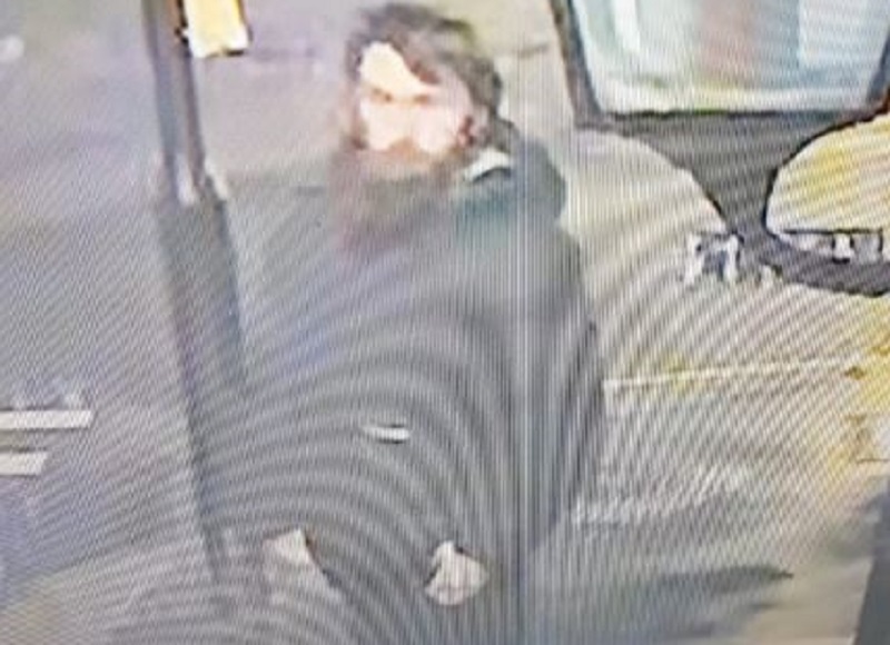 The suspect is described as a white man, between 20 and 30 years old, with a large, bushy beard. He was wearing a dark grey or green puffer-style jacket.