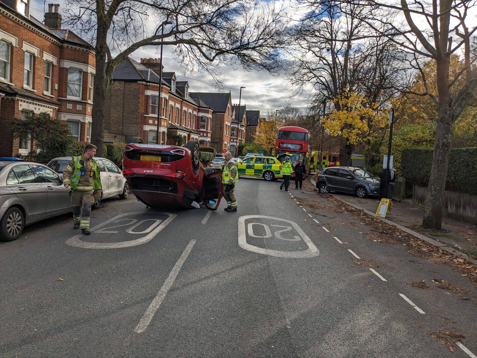 A car that has flipped on its roof in Croxted Road is made secure by emergency services (Picture: Jim Rivers)