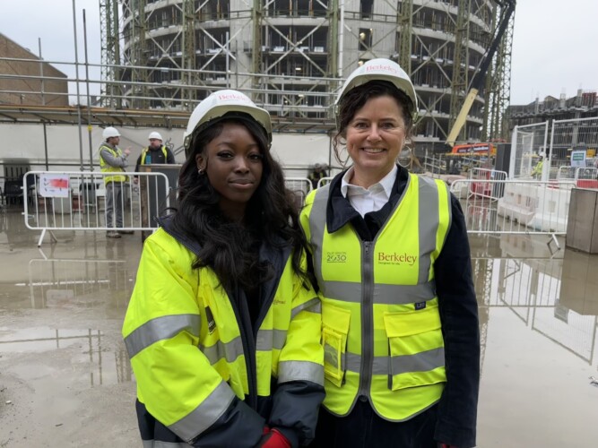 Cllr Claire Holland, leader of Lambeth council, and Secretary of State for Education, Bridget Phillipson MP, joined young apprentices working on Oval Village, a Berkeley Group housing development in Kennington Lane, Vauxhall.