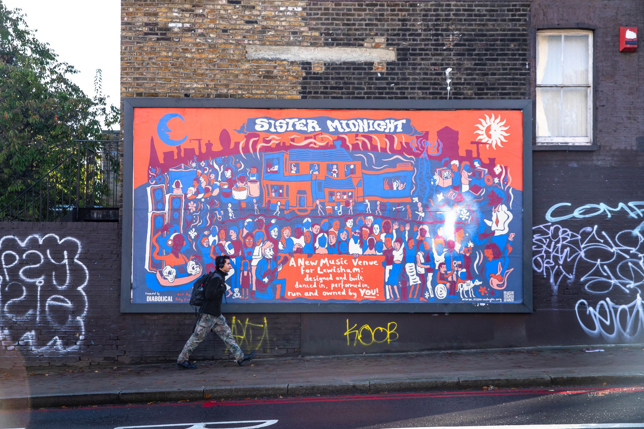 A billboard near Goldsmiths University promoting Sister Midnight – which will open their new venue in the Catford Centre next spring (Picture: DIABOLICAL)