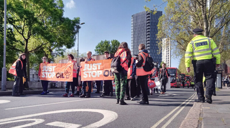 At around 8:45 am, 28 Just Stop Oil supporters began marching from Newington Causeway, near Elephant and Castle, towards the Inner London Crown Court, where another demonstration was taking place.