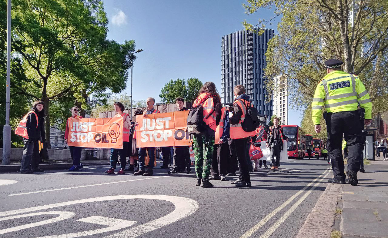 At around 8:45 am, 28 Just Stop Oil supporters began marching from Newington Causeway, near Elephant and Castle, towards the Inner London Crown Court, where another demonstration was taking place.