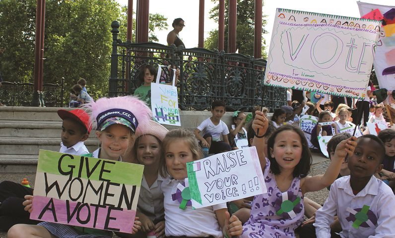 Clapham Manor Primary School kids celebrate 100 years of women having the vote