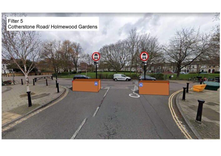 Filter Five will stop motor vehicles entering or leaving Cotherstone Road at its junction with Holmewood Road.