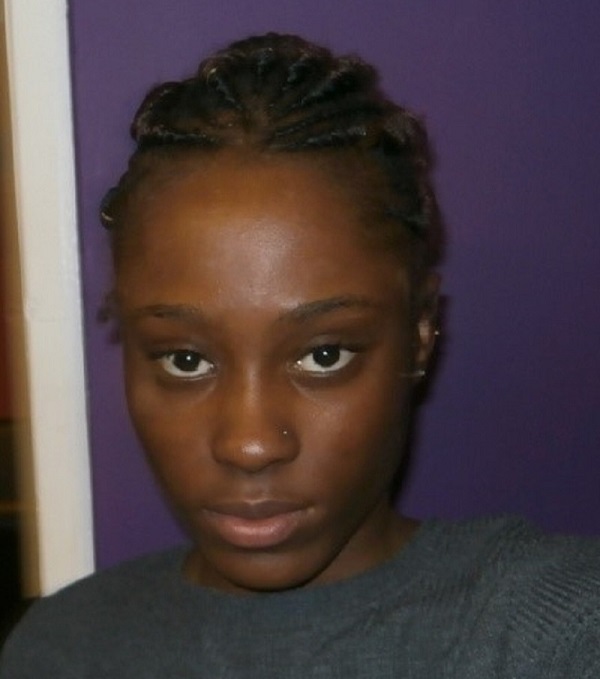 She had brown braided hair with gold clips, and was wearing a dark hooded jacket possibly with a fur-lined hood, with dark-coloured leggings and trainers.