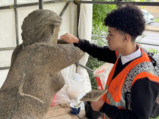 Grace Mensah, age 11, who was also involved in the door-to-door fundraising said: “I feel really proud of us because we went door-to-door, knocking on them with leaflets to ask if they want to donate, and I think people did donate quite a bit of money to help us to bring this Leaning Woman back stronger. Carved concrete sculptures made by pupils from Westside Alternative Provision School were also on display.