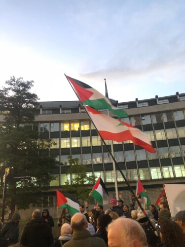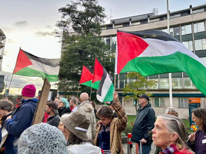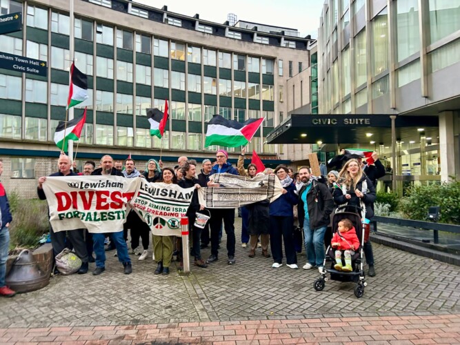 Protesters from Lewisham Divest For Palestine and Lewisham Palestine Solidarity Campaign (PSC) gathered outside the council’s offices in Catford Road, as the borough’s councillors held their monthly meeting.