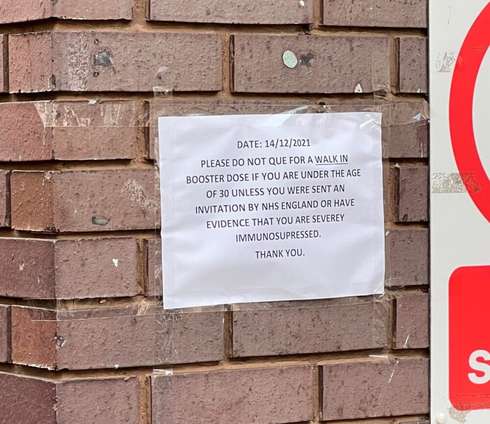 The poster, dated December 14, read: “Please do not que for a walk in booster dose if you are under the age of 30 unless you were sent an invitation by NHS England or have evidence that you are severely immunosuppressed.”