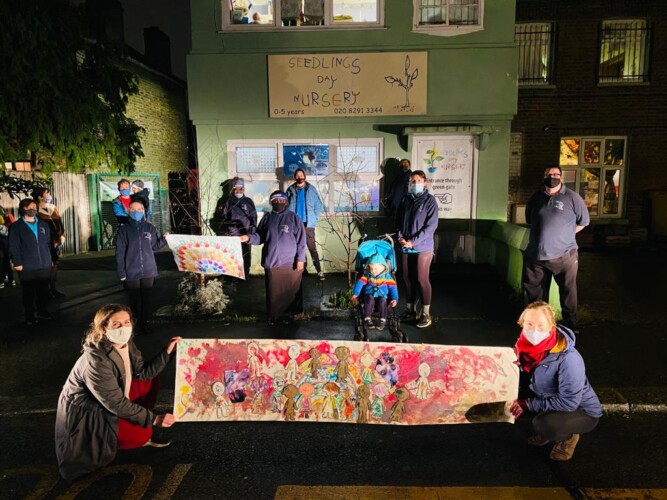 Pictured top: Staff, parents and children at Seedlings Day Nursery, with a banner made by the children