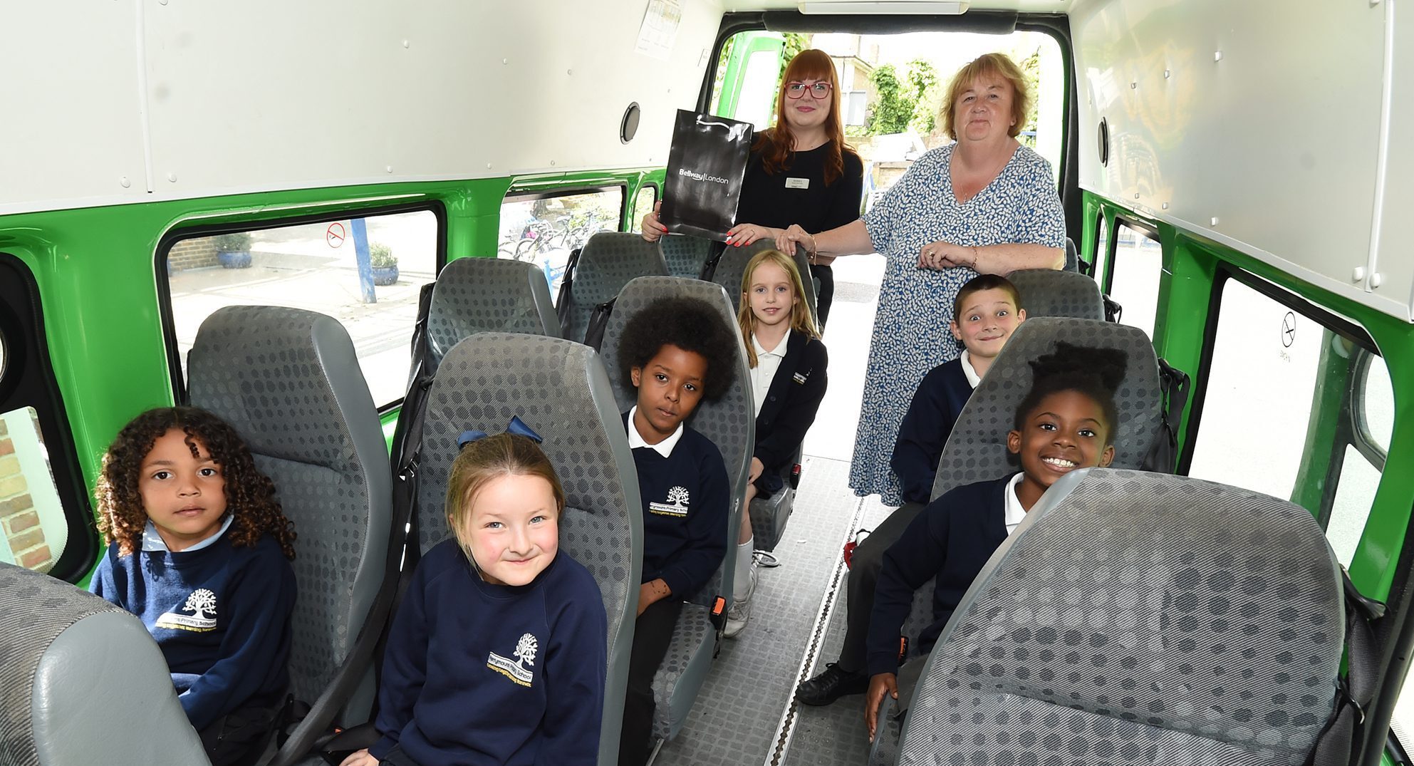 Pictured top: Children from Perrymount Primary School with headteacher Christine-Keen and Bellways Agnieszka Komza on the old minibus (Picture: Bellway London)