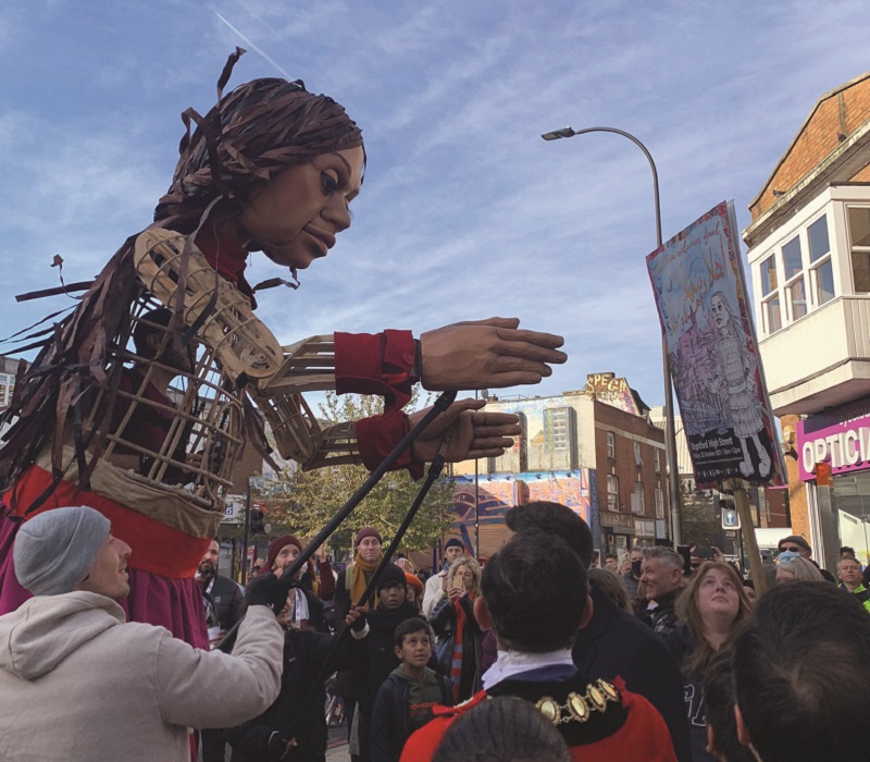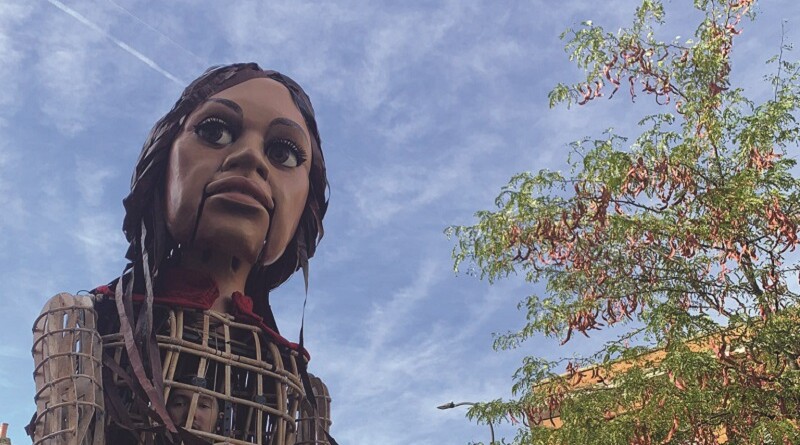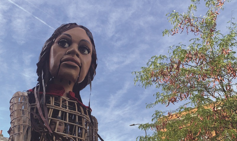 Amal is a 3.5 metre-tall puppet of a nine-year-old unaccompanied Syrian refugee girl. She walked 8,000km walk across 65 towns, cities and villages from the borders of Syria to Manchester.