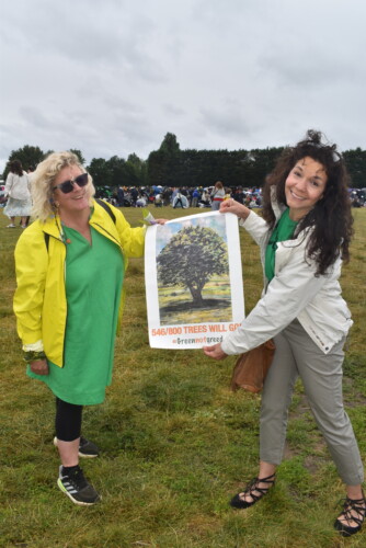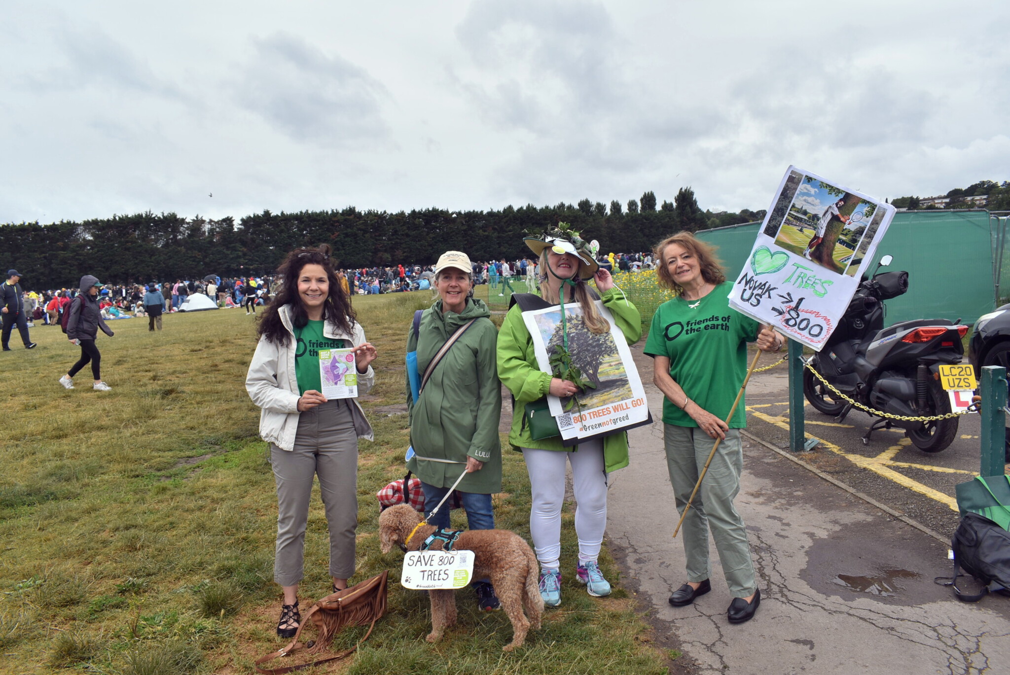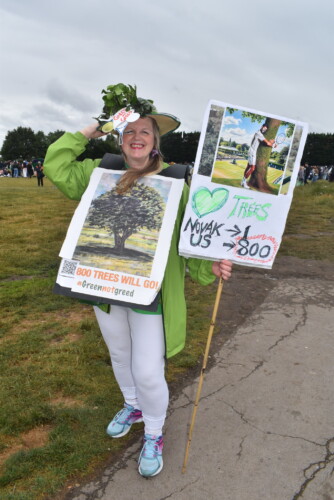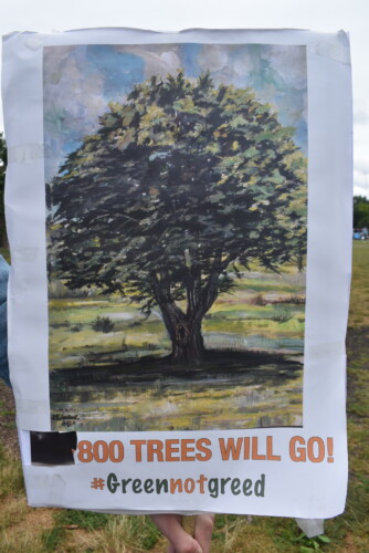 Protesters held posters and banners featuring art work by Wimbledon artist Sarah Edgedale Donlan which read, “800 trees will go #Green not Greed”.