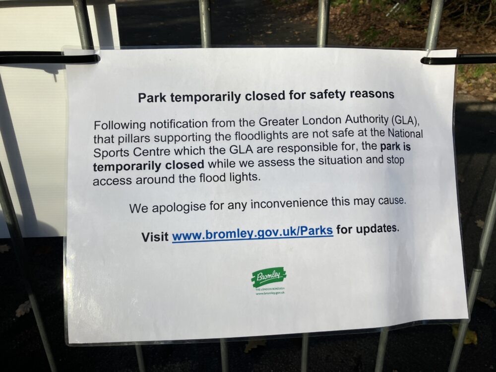 On Sunday, Bromley council said in a statement that Crystal Palace Park was temporarily closed, after the Greater London Authority had told it that the pillars supporting the floodlights at the National Sports Centre were not safe.