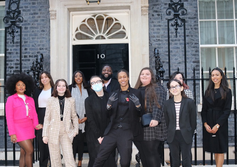 Members of Hope Collective, including Tyrell Davis-Doughlin (gloves) on steps of No 10.