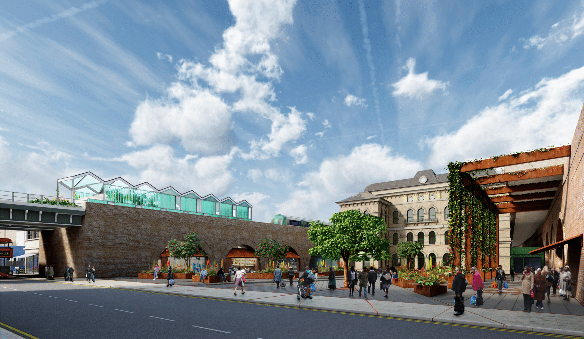 The newly-renovated façade of the 1860s station building will be enhanced by new surroundings while the dilapidated 1930s arcade will be removed in order to reinstate the original forecourt with planting.