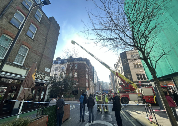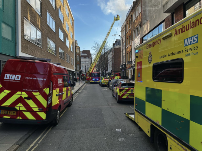 Six fire engines and about 40 firefighters tackled the blaze at a mixed-use building in Tottenham Street, near Goodge Street Tube station.