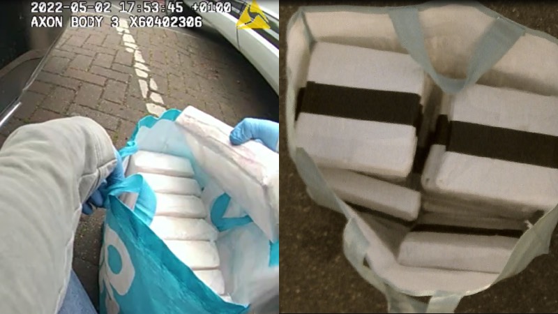 The Ford drove off and was followed by officers, who stopped it a few minutes later. It was searched and 20kg of cocaine with an estimated street value of £1.8million were found in the shopping bags.