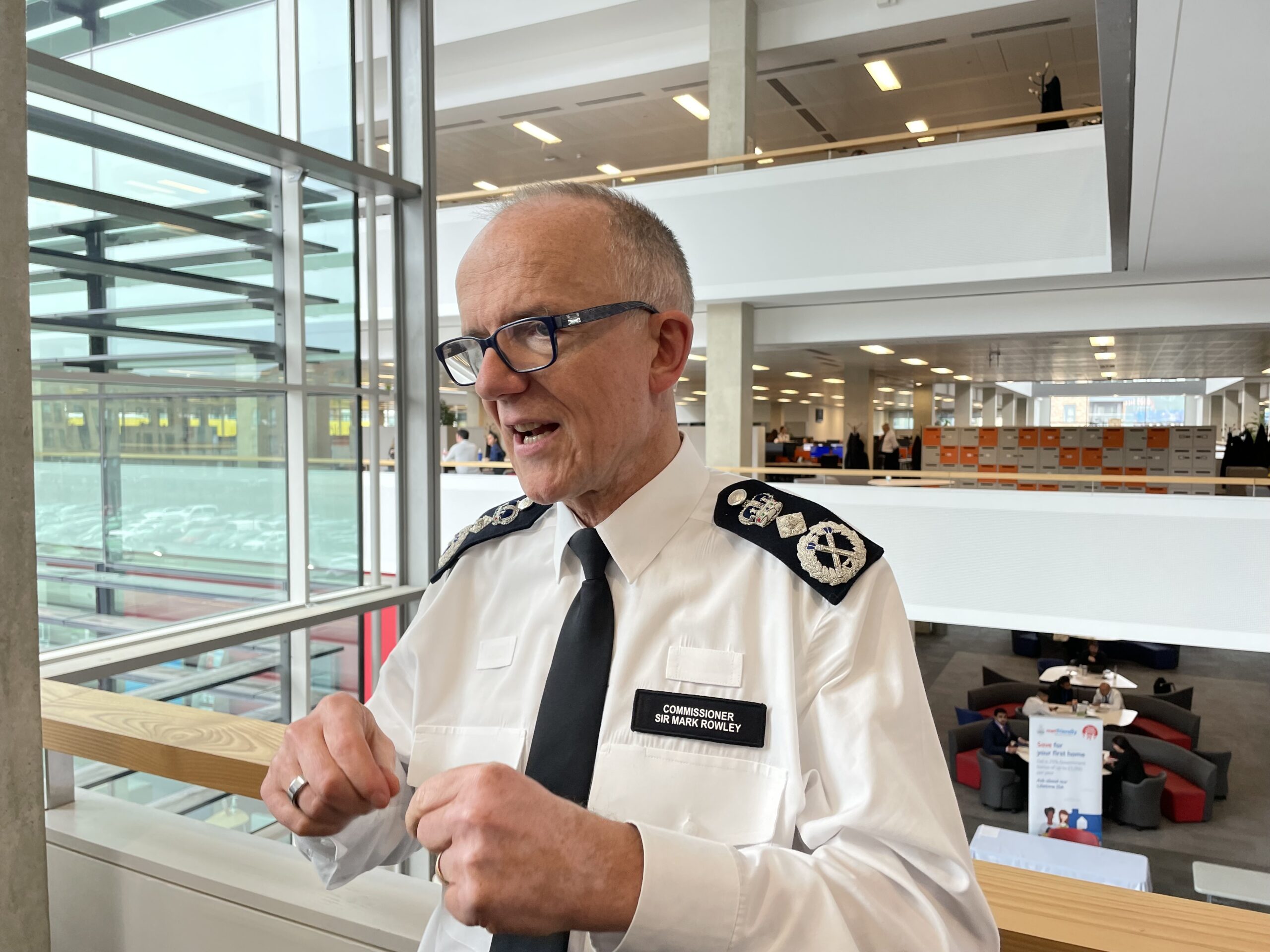 Pictured top: Met Commissioner Sir Mark Rowley, speaking to reporters this week at Hendon Police College (Picture: Noah Vickers)
