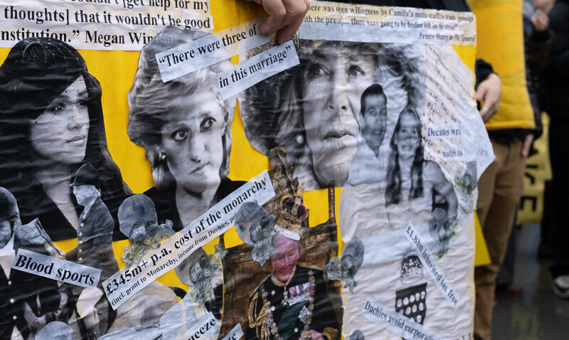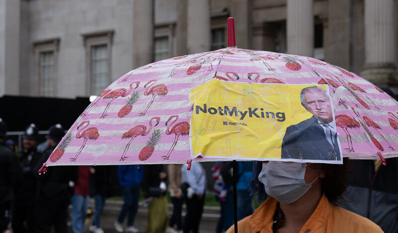 Pictured top: Protestors at King Charles’ coronation outside the National Gallery in Trafalgar Square (Picture: Matt Durant)