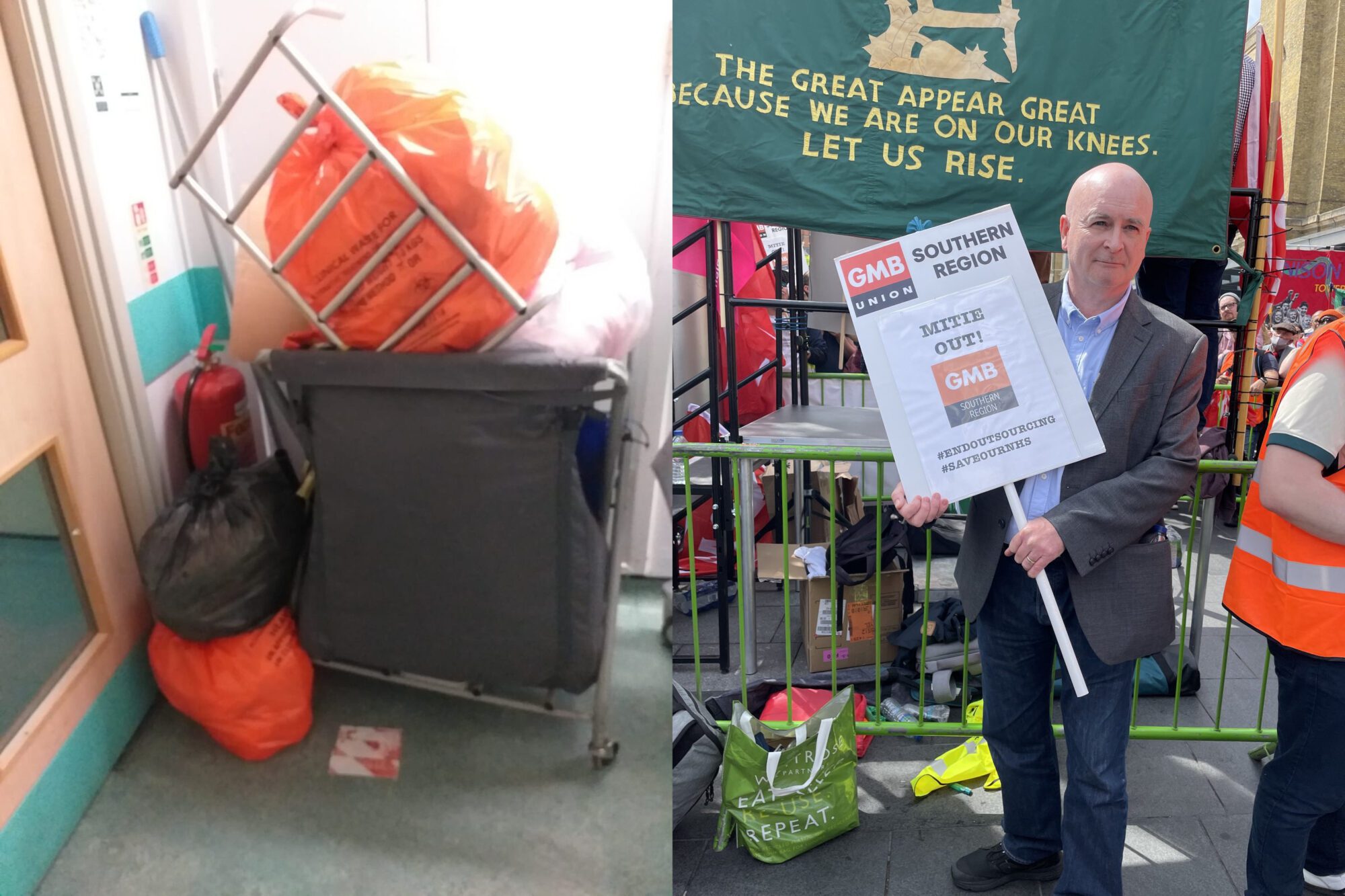 Mick Lynch joins striking hospital cleaners as bins overflow on wing
