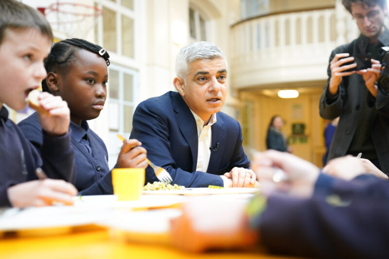 Pictured top: Sadiq Khan with children at a school breakfast club (Picture: PA)