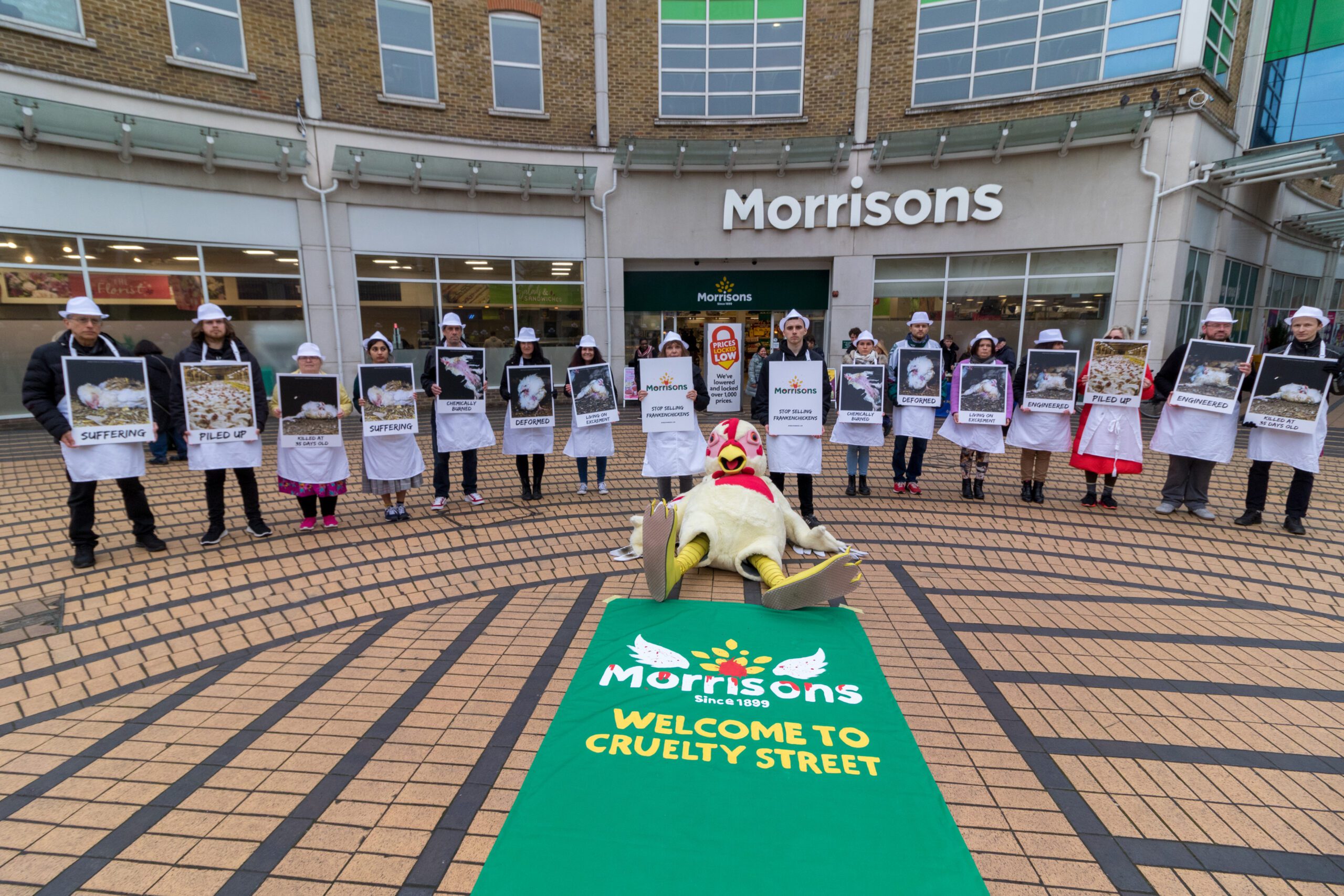 Protesters occupied the entrance of a Morrisons supermarket accusing the chain of “humane washing” over alleged fake promises around how its chickens are reared.