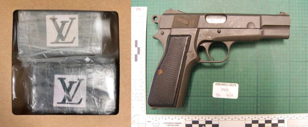Police recovered them and found one rucksack with 447 wraps of cocaine, valued at more than £22,000, and the other rucksack with a revolver, a sawn-off shotgun, a loaded Inglis Browning 9mm automatic pistol and a large quantity of ammunition.