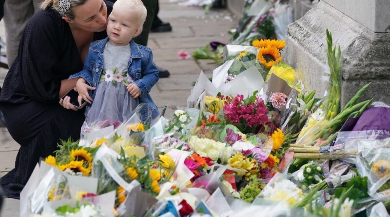 Pictured top: A woman kisses a small child as they look at the flowers laid outside Buckingham Palace following the death of Queen Elizabeth II yesterday (Picture: PA)
