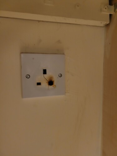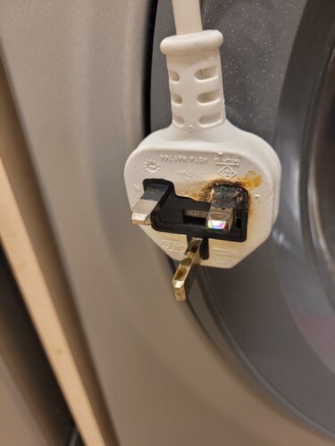They managed to pull the washing machine away from the wall to find that the prongs of the plug had been burnt out. The socket also showed clear signs that it had sparked out and was accompanied by a burning smell.
