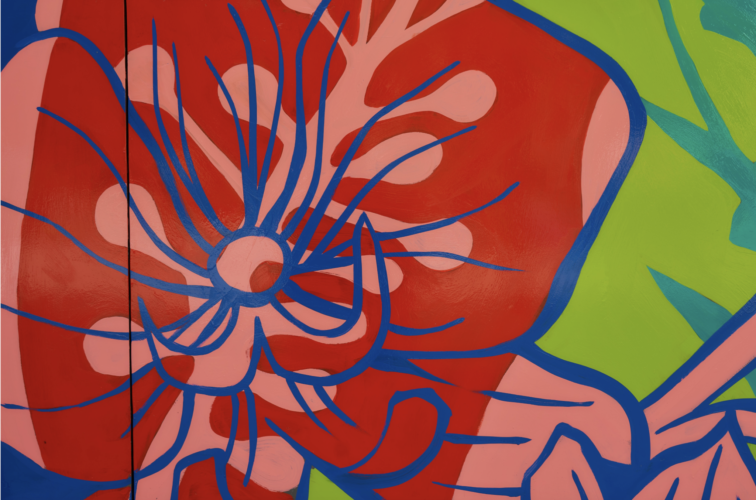 The mural features illustrations of native Latin American flowers, including Orchids, Heliconias, and Hibiscus.