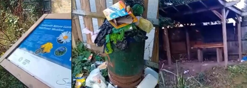 In his video, we see the park – at the junction of Meeting House Lane and Goldsmith Road – with an overflowing bin and rubbish strewn all around it. We see park benches surrounded by overgrown weeds and discarded plastic bags of dog faeces, bleach bottles, boots, and even a used condom.