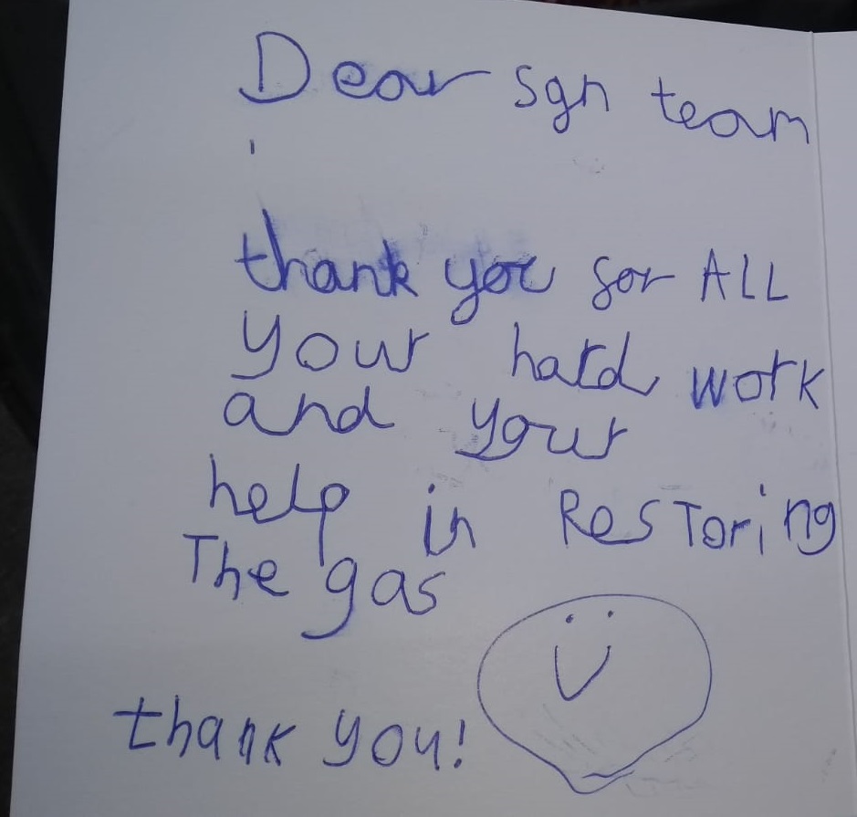 engineers were particularly grateful for the ‘thank you’ card and chocolates that one young