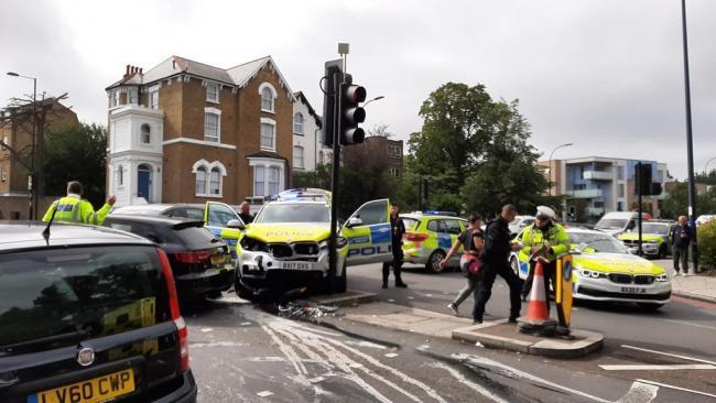 An armed police car responding to an emergency call crashed into two other vehicles and a traffic island at the junction of Burnt Ash Hill and Westhorne Avenue just before 10am on Thursday (August 20).
