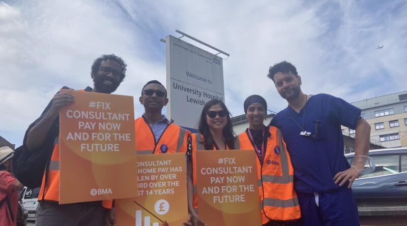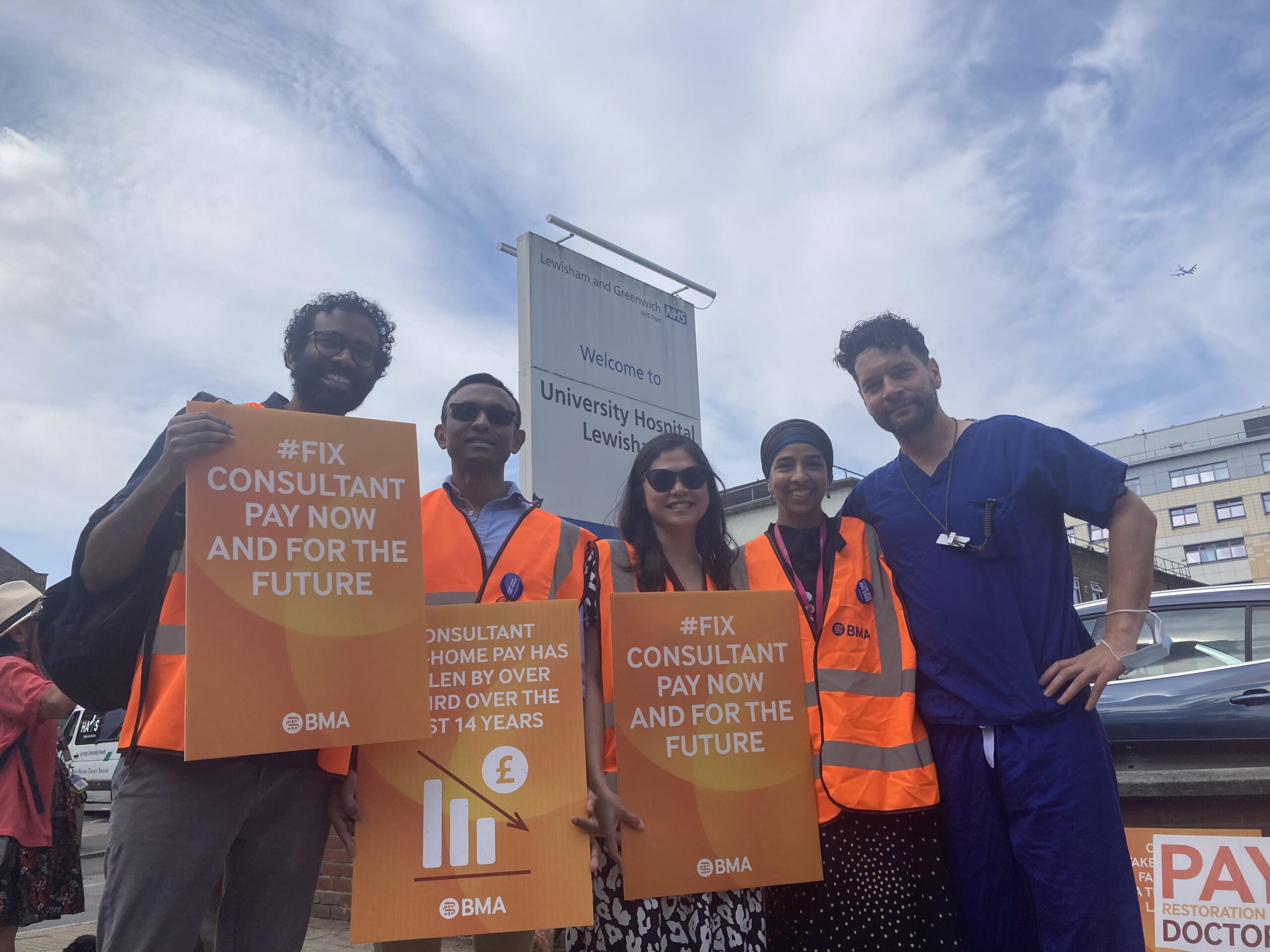 NHS consultants on the picket line outside Lewisham Hospital on Friday over the Government’s six per cent pay offer said hospital doctors at all levels felt underpaid and overworked.