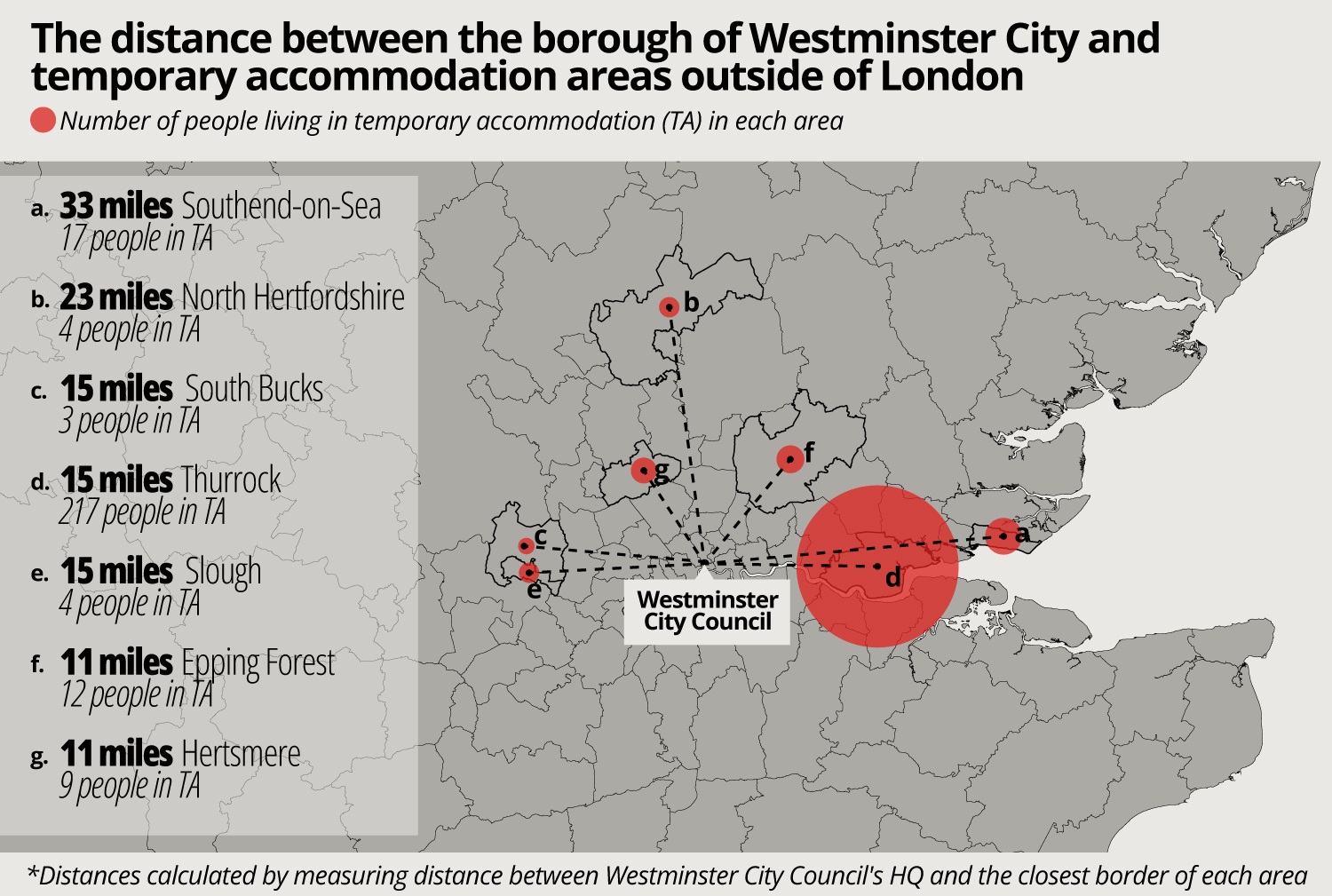 Since 2020, Westminster City council has sent people as far as 33 miles away to Southend-on-Sea, and up to 23 miles away to North Hertfordshire and South Bucks.