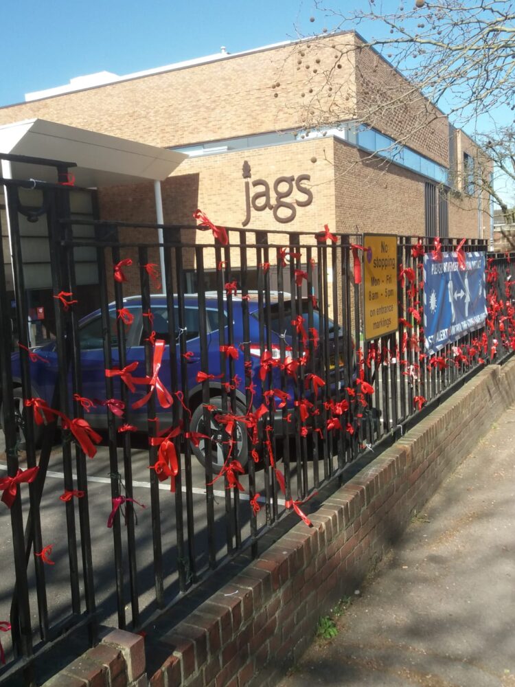 Red Ribbons have been tied to the gates outside Jags in response to the allegations.