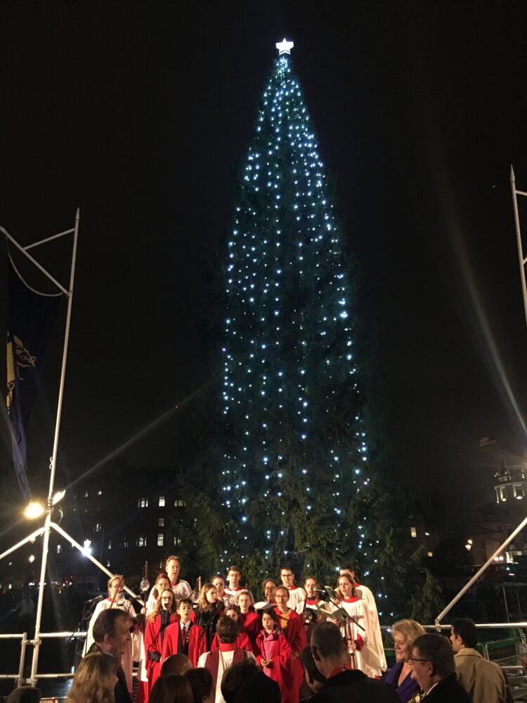 And London returns the hospitality at the tree lighting ceremony and carol singing in early December.