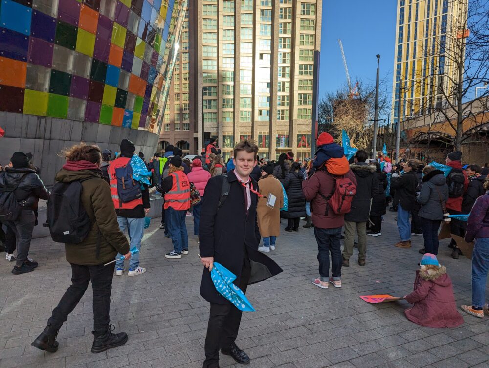 More than 100 people gathered outside Glass Mill Leisure Centre in Loampit Vale, Lewisham, before heading into central London to join the national rally.