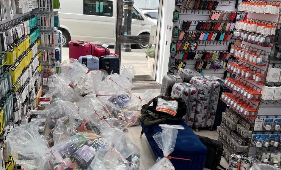Pictures of the raid show 43 bags worth of illegal and fake goods stacked on the shop’s floor.