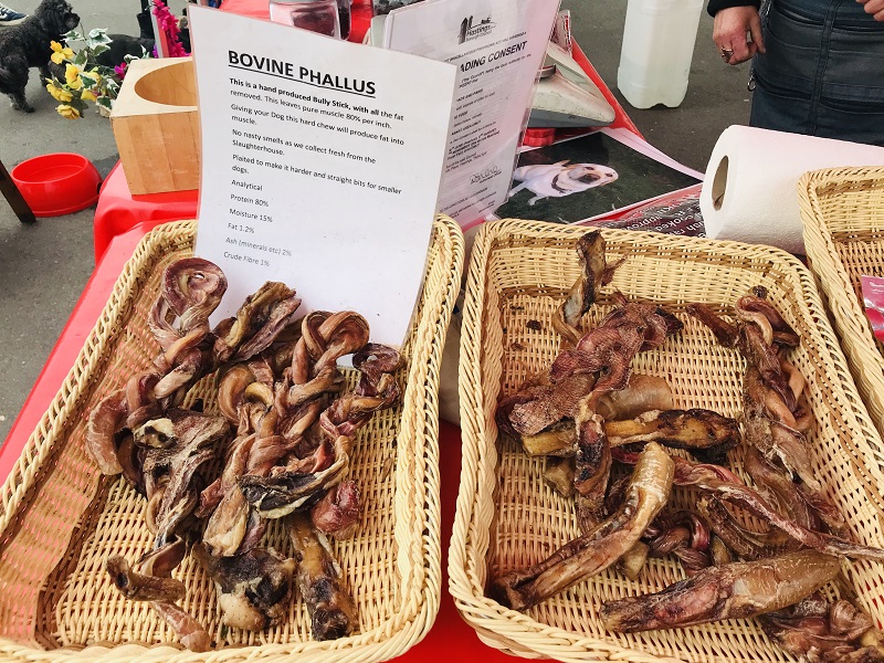 The pet chef uses recycled slaughterhouse food scraps from Tottingham Farm in East Sussex to make “pooch party bags” and treats, including ox liver, bacon teasers and bovine phalluses.