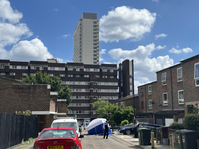 Pictured top: Police and forensics at the scene on Friday in Carteret Way with the Pepys estate seen in the background (Picture: Claudia Lee)