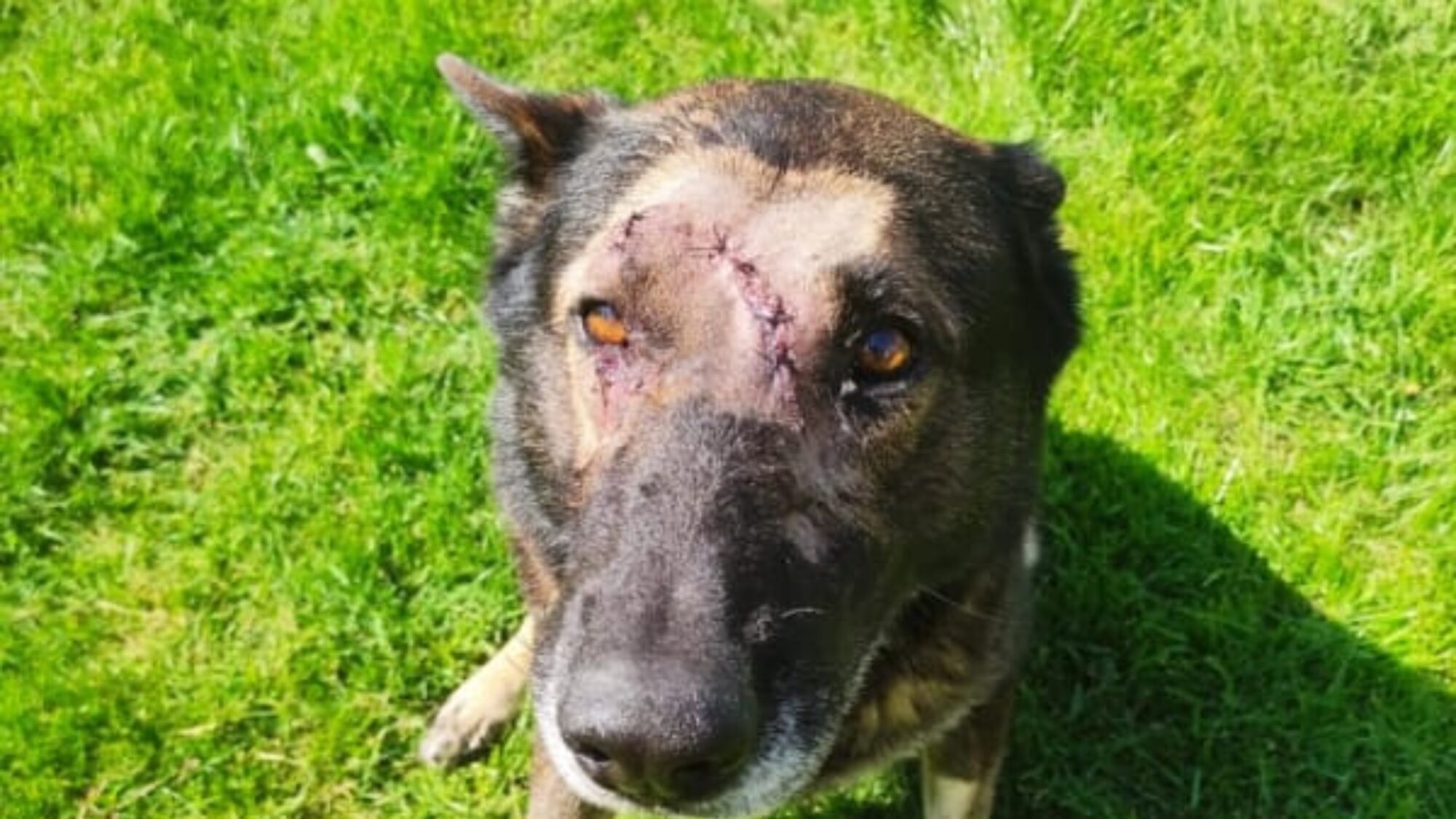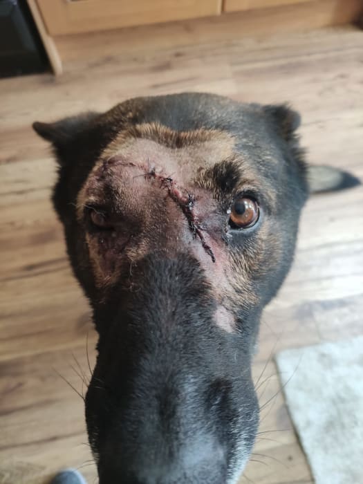 He was rushed to the vets and the blows to the top of his head were found to have struck bone, narrowly avoiding lasting injury, or worse.