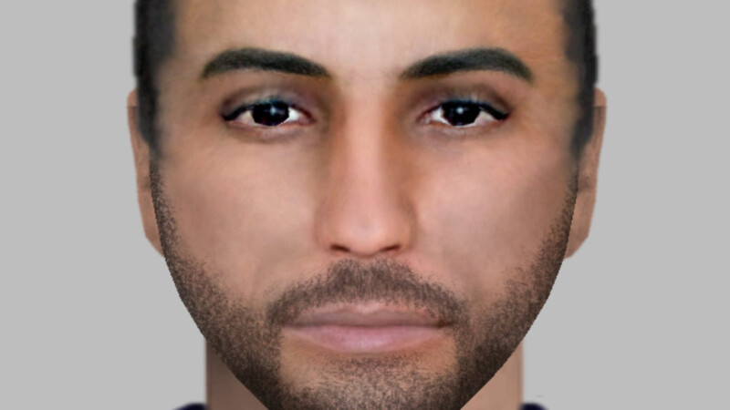 The e-fit suspect is described as 5ft 8ins tall with a stocky build and was wearing a blue hoodie. He also had dark facial hair.
