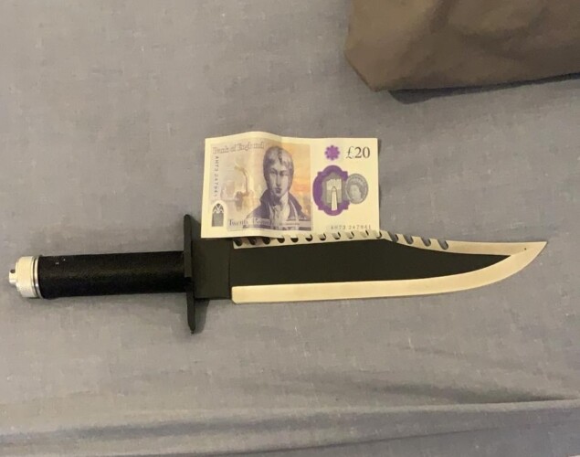 Officers found 300-400 wraps of suspected class A drugs, 1.5 kilos of cannabis, approximately £60,000 cash and a large rambo style knife at his house.