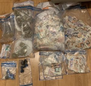 Officers found 300-400 wraps of suspected class A drugs, 1.5 kilos of cannabis, approximately £60,000 cash and a large rambo style knife at his house.