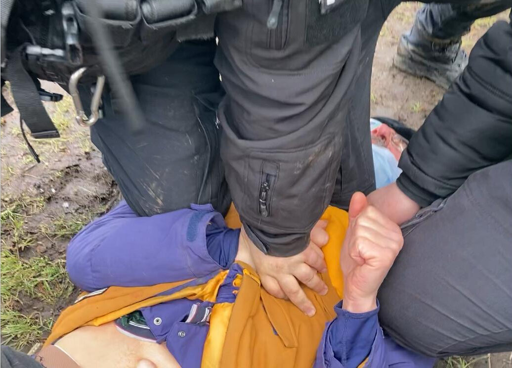 The man, named by Extinction Rebellion as Dmitri, is seen being restrained by security guards in a video shared by protesters.