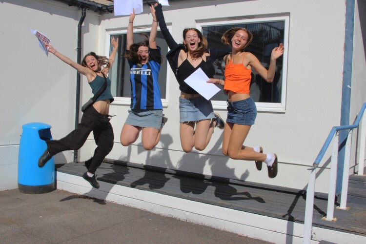 Pictured top: Up, up and away – a moment of unbridled joy for these sixth-formers after getting their results (Picture: Charter North, Dulwich)