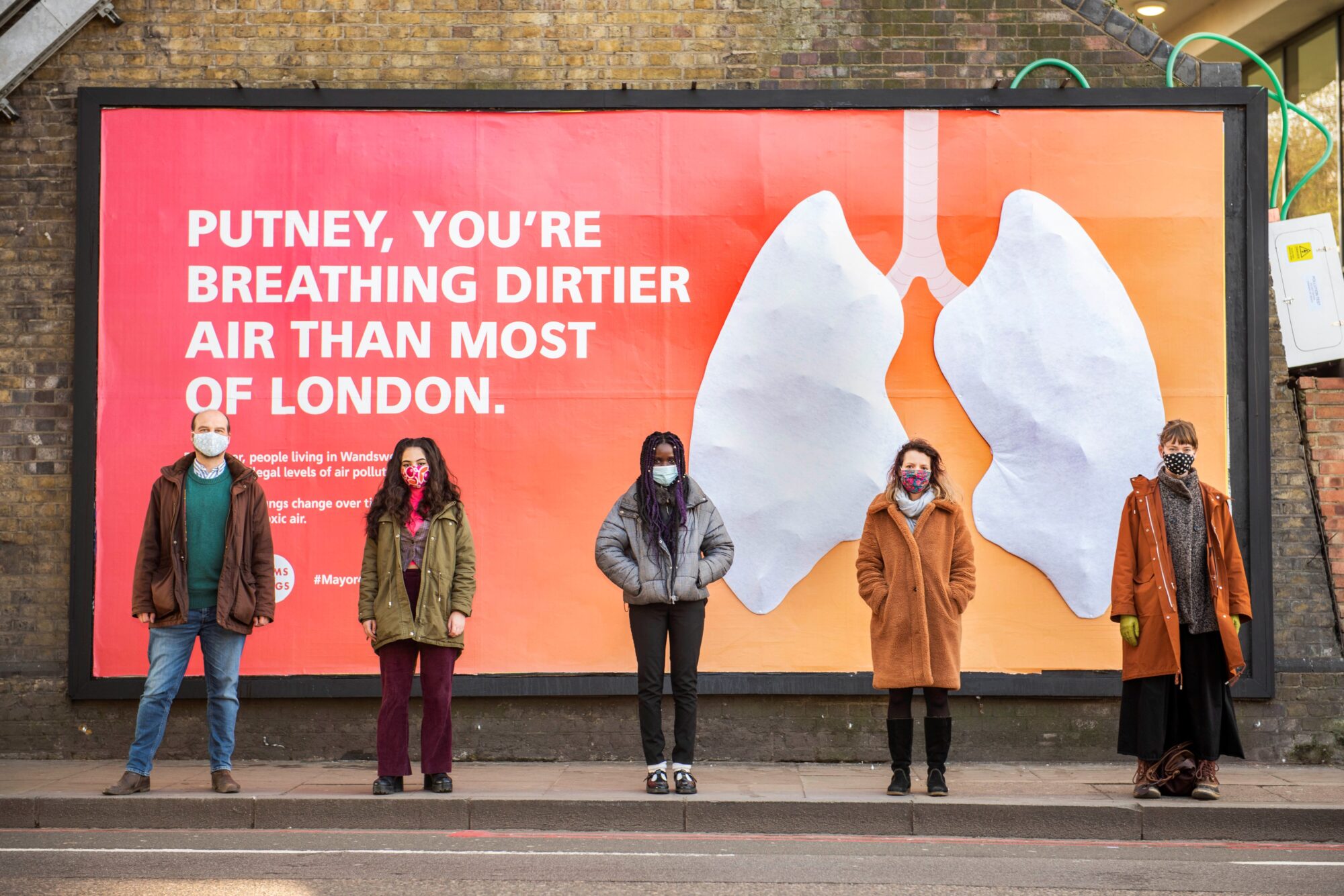 Pictured top: Air pollution campaigners next to a poster (Left to right: David Nicholson, Anjali Raman-Middleton, Destiny Boka Batesa, Jemima Hartshorn, and Claire McDonald)