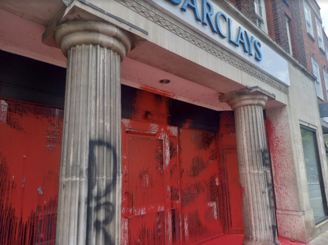 Pro-Palestine protesters have targeted Barclays bank branches across the country by smashing windows and covering buildings in red paint.