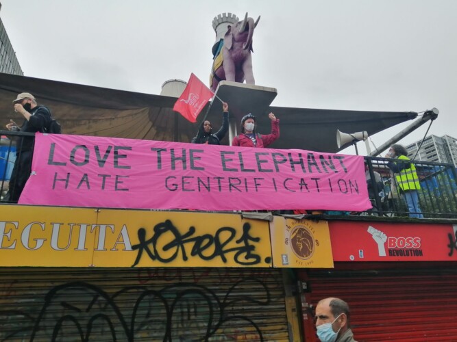 Campaigners against the closure of the Elephant and Castle Shopping Centre chanted “homes for people, not profit” at a protest on Thursday evening.